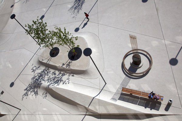 整個工程只采用了兩種建材,斜坡、臺階和墻壁使用了混凝土,欄桿和覆蓋層則使用了柯爾頓鋼。廣場圍墻使用的是混凝土加木材。光線從兩點照射過來,強調了噴泉的價值和全新的空間。